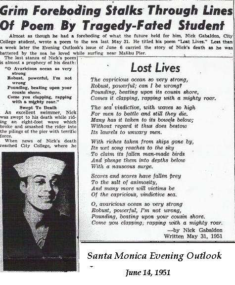 They were close now. "We can make it!" Nick yelled. But the others, doubted, pulled out. The something inside him told Nick he could make it. He bore on. His heart pounded; the rise and fall ... there was hope! Until that last eternal instant when the wave exploded all around him and he was committed and it was suddenly all too clear and his body bent to the will of that one eternal wave of his capricious, vindictive sea, and he flew with the full force of that wave, headlong amongst the pilings. From the beach they had all seen. They ran to help, but there was no trace. They dived all day, searching, found nothing. In the next morning's newspaper, a news item appeared: "Eyewitnesses today described how Nicholas Gabaldon, 20, student at Santa Monica City College, was swept to his death yesterday afternoon while surfing near the Malibu Pier ..." Nine days later, only a little way down the beach from where the terrible thing happened, Nick Gabaldon's body washed to shore. |