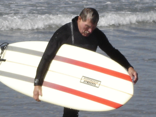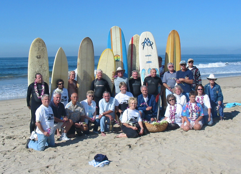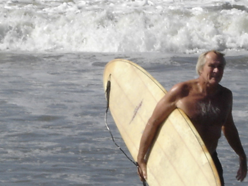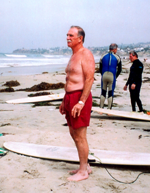We all walked out to the sand and gathered together for a few moments of prayers and remembrances. Everyone who either surfed or swam out took an orchid and Jennifer and Scott took a small handful of their Dad’s ashes to scatter. Everyone formed a circle and shared some thought or memory of Stuart and then splashed some of his beloved ocean heavenward for him. To use a Scottish expression, I know he would have been “Fair pleased”. I've also attached the flyer that we handed out that day. It has a very good and fairly recent photo of Stuart, his Ford woody, a daffodil (his favorite) and an appropriate cartoon he drew for me some years ago. Use it if you wish. Life goes on, and now, the presence of that absence is everywhere. Life goes on but it sure isn’t the fun it used to be. - Sandy Lough |