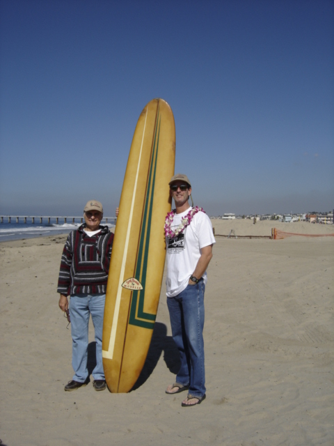 Ray Moselle, Mike Faneuff with Mike's "new" old classic R&R Moselle surfboard |