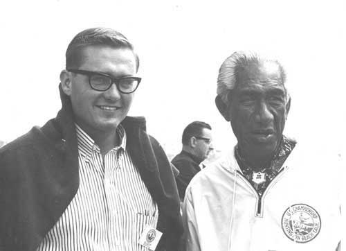 I had the honor of sitting with Duke Kahanamoku during the US Surfing Championships at Huntington Beach Pier in 1964. It was a day I will always treasure and he only laughed at my "Steve Allen" glasses once or twice ... I think. (Photo by Ron Church) |
