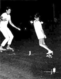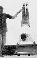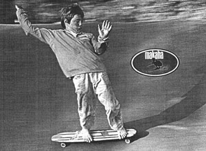 Larry based his prototype on a cross between a homemade skateboard and a surfboard. He came up with the idea one summer while sitting in his tower and noticing the similarity between the skills involved in skateboarding, surfing and skiing. The first boards were put together by Larry and his wife, Helen, at home in their garage. It wasn't long before Larry started looking for a way he could promote his new product as well as the emerging 'sport' of skateboarding and he started Surfguide Magazine and formed a competition team made up of Southern California's top skateboarders. (see Surfguide Magazine and the official Makaha website) |