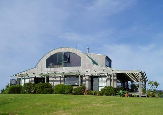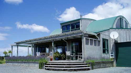 (Right) The front of our house on the hill above Matapouri Bay. The house is nearly set on a north-east-south-west axis: the front of the house faces almost due north and this shot is taken looking towards the south-east. The west facing upstairs window just above the SKY satellite television dish is the window I look out of when I'm looking for inspiration. I often see seagulls, herons, hawks, wood pigeons, larks, swallows and ducks fly by over the valley below our property. |